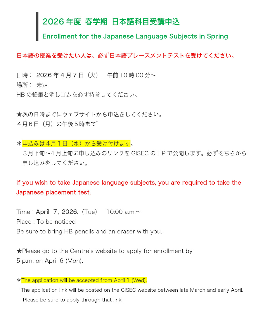 202602.06[ Fri. ]2026年度春学期日本語科目受講申込(予告)Preliminary Announcement: Application for Japanese Language Courses, Spring Semester 2026
